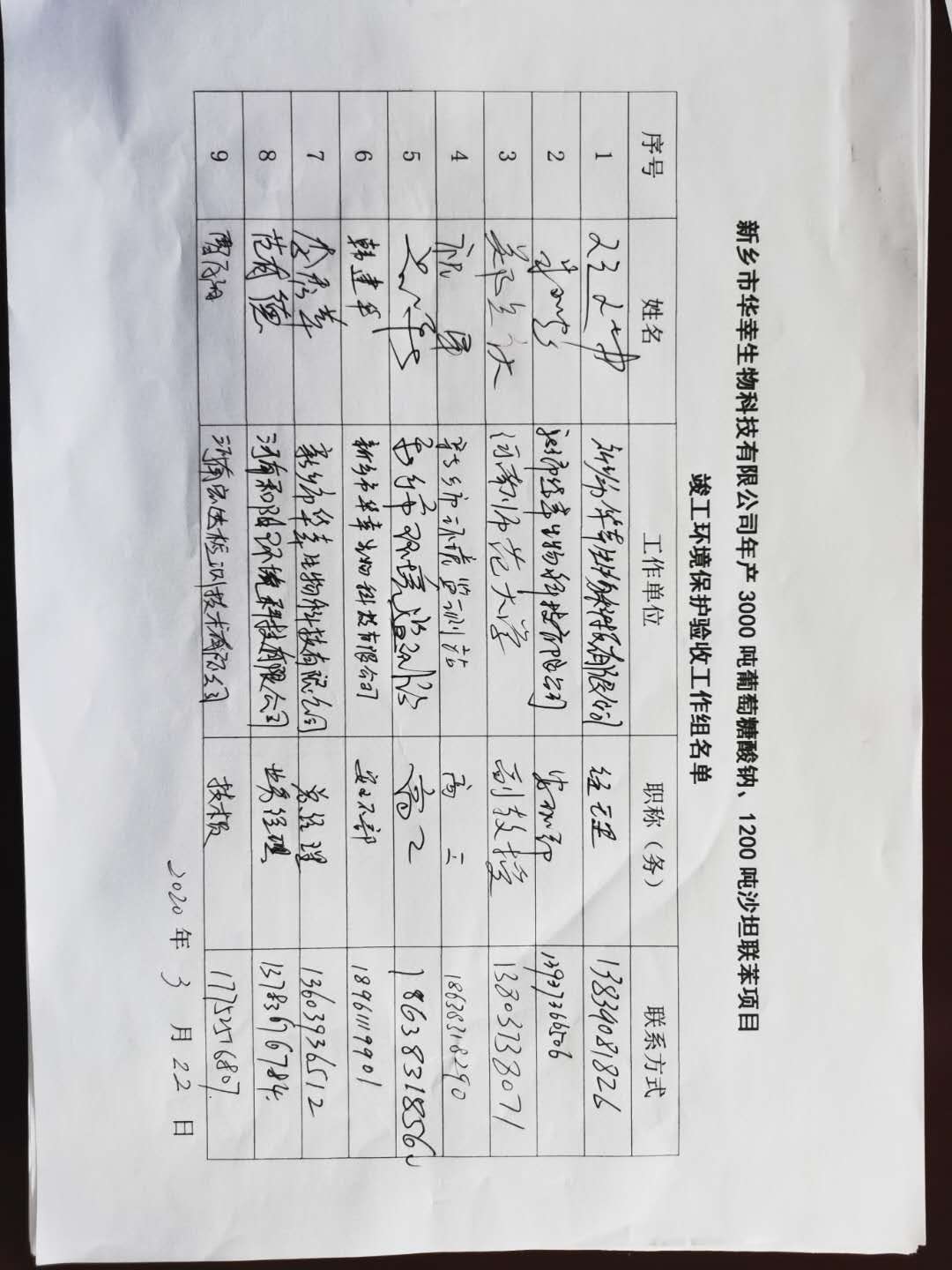 依據(jù)國務院第682號文頒布的新《建設項目環(huán)境保護管理條例》和原環(huán)境保護部國環(huán)規(guī)環(huán)評[2017]4號文公告的《建設項目竣工環(huán)境保護驗收暫行辦法》的相關要求,新鄉(xiāng)市華幸生物科技有限公司于2020年1月20日在新鄉(xiāng)市華幸生物科技有限公司廠區(qū)召開會議,對新鄉(xiāng)市華幸生物科技有限公司年產(chǎn)30000噸葡萄糖酸鈉、1200噸沙坦聯(lián)苯項目進行竣工環(huán)境保護驗收。會議成立了驗收工作組,成員由建設單位新鄉(xiāng)市華幸生物科技有限公司、驗收檢測單位河南和陽環(huán)境科技有限公司、河南宏達檢測技術有限公司的代表及邀請的技術**組成(驗收工作組名單附后)。會前,驗收工作組成員對工程主要生產(chǎn)設施、環(huán)保設施進行了現(xiàn)場檢查,會議聽取了建設單位關于項目建設情況及竣工環(huán)保工作的情況介紹、竣工環(huán)保驗收監(jiān)測報告編制單位關于驗收監(jiān)測工作技術匯報,查閱了竣工環(huán)保驗收監(jiān)測報告,核實了有關資料。經(jīng)過認真審議與討論,形成如下驗收意見: